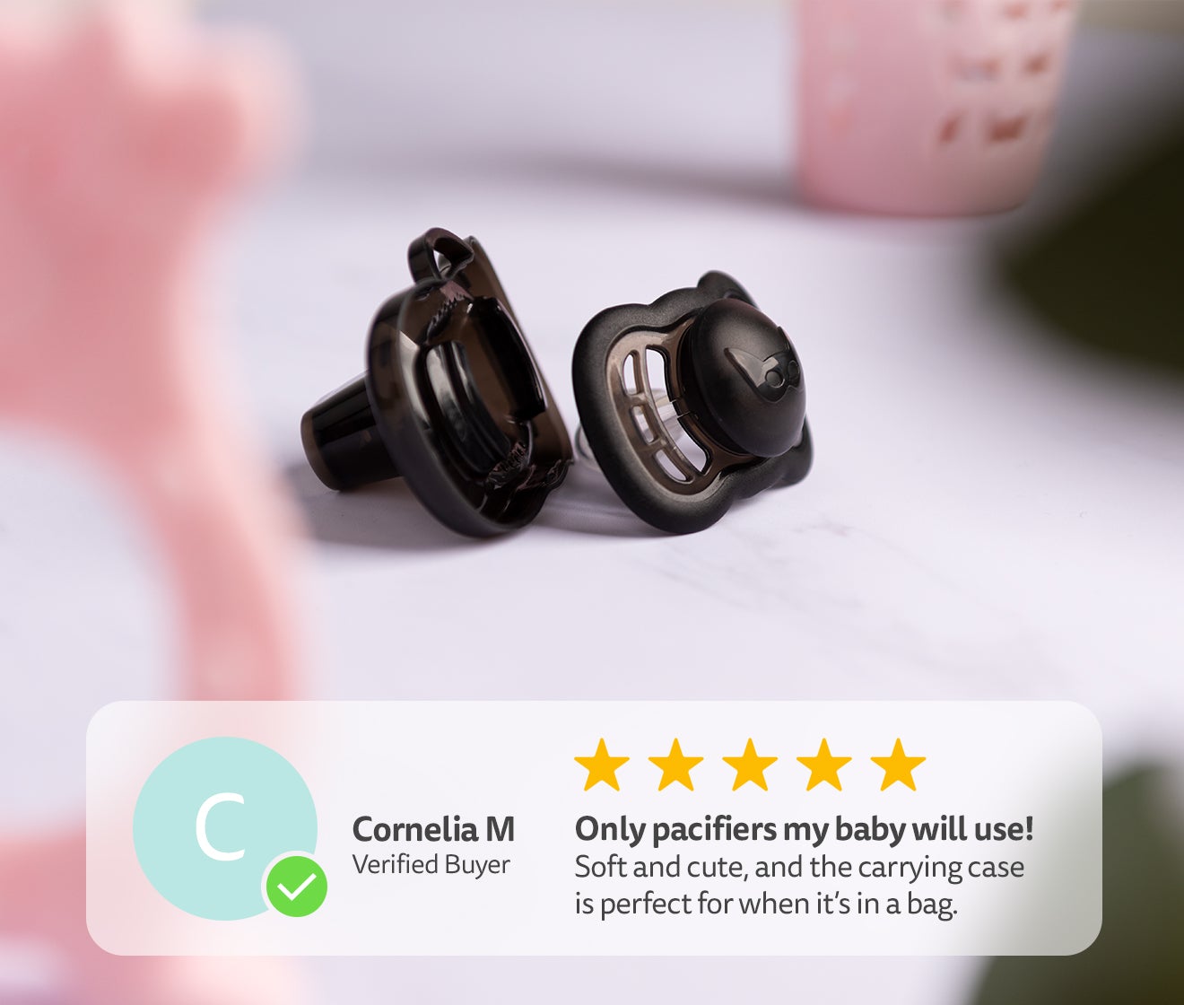 Confezionato in busta, la custodia protettiva inclusa mantiene il succhietto sicuro e pulito durante il trasporto.