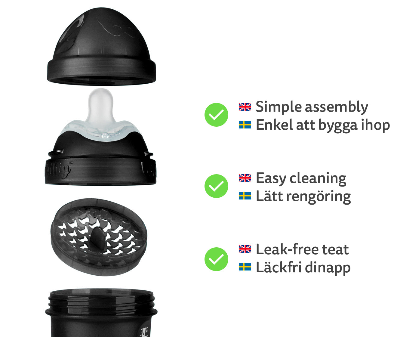 Con i biberon tradizionali è facile che si formino grumi che si bloccano nella tettarella durante la preparazione della pappa. Con il nostro innovativo coperchio mixer e la rete interna, ottieni una miscelazione uniforme e puoi essere certo che non restino grumi.
