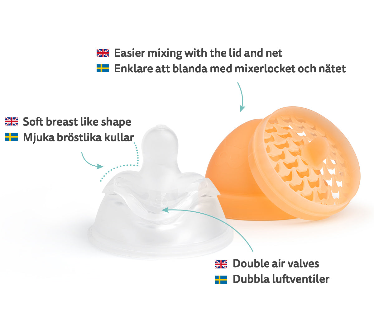 Con i biberon tradizionali è facile che si formino grumi che si bloccano nella tettarella durante la preparazione della pappa. Con il nostro innovativo coperchio mixer e la rete interna, ottieni una miscelazione uniforme e puoi essere certo che non restino grumi.
