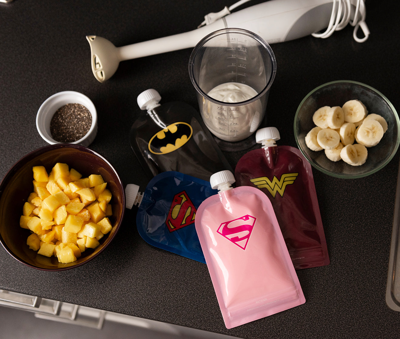 Ladda upp för heroiska måltider med våra DC Comics-klämmisar i designerna Supergirl, Superman, Batman och Wonder Woman. Fyll dem med näringsrikt mellis som ger ditt barn extra superkrafter inför dagens alla äventyr.