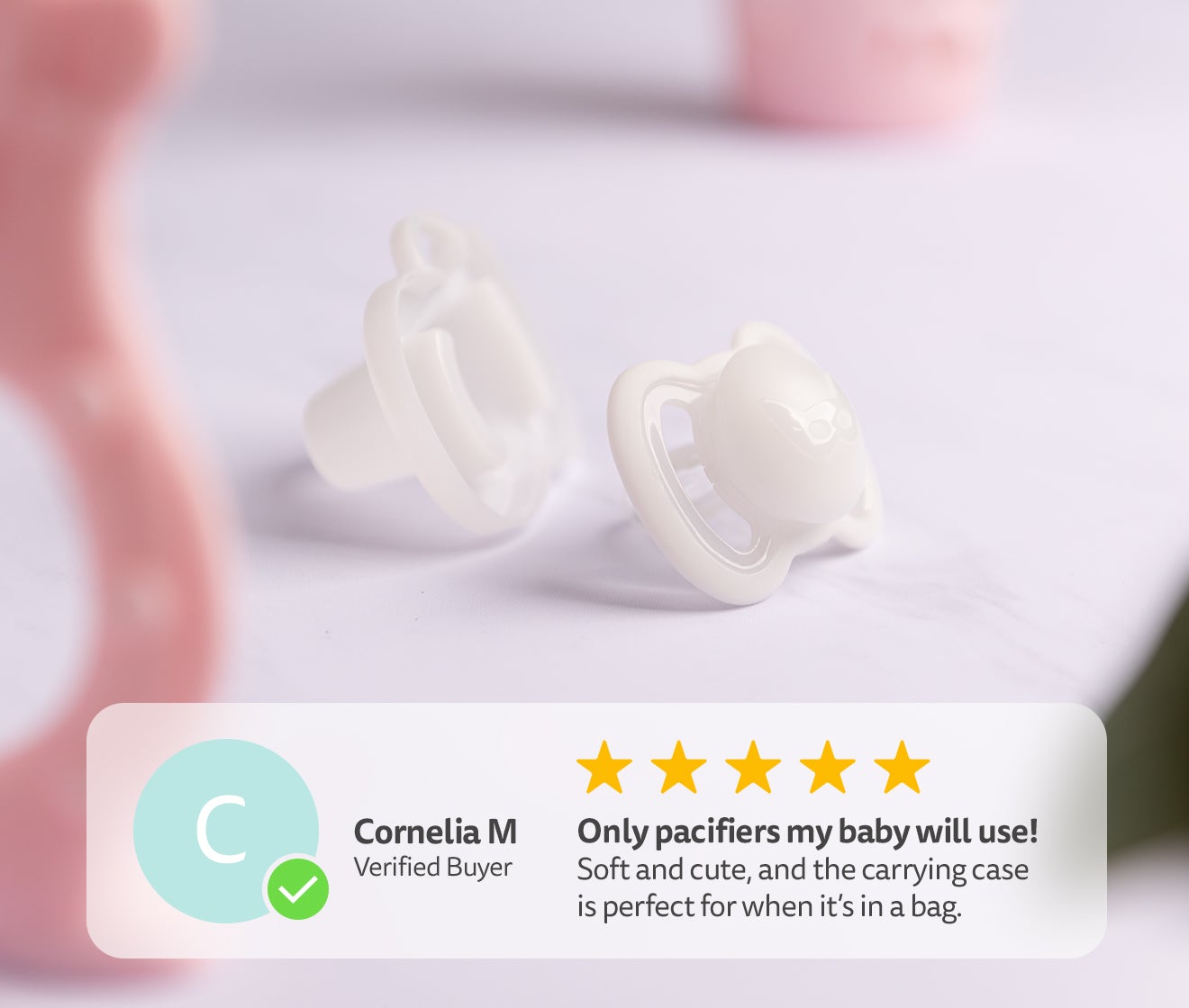 Confezionato in busta, la custodia protettiva inclusa mantiene il succhietto sicuro e pulito durante il trasporto.